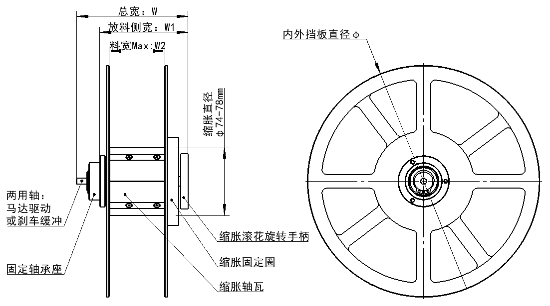 6、超平的固定和活動擋板脹緊后在放料起始狀態(tài)即能限制卷料的軸向偏移,提高送料精度。